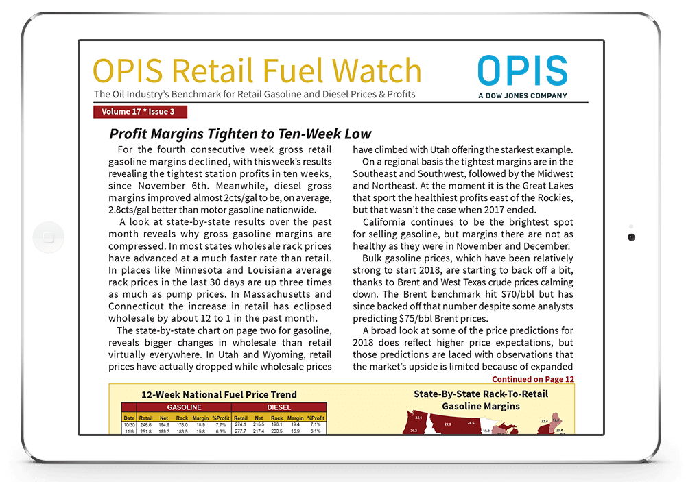 OPIS Retail Fuel Watch newsletter is your convenient weekly scorecard for grading retail profit performance against key competitors in over 300 regional markets. Easy-to-read charts, graphs and tables put vital retail fuel market intelligence at your fingertips.