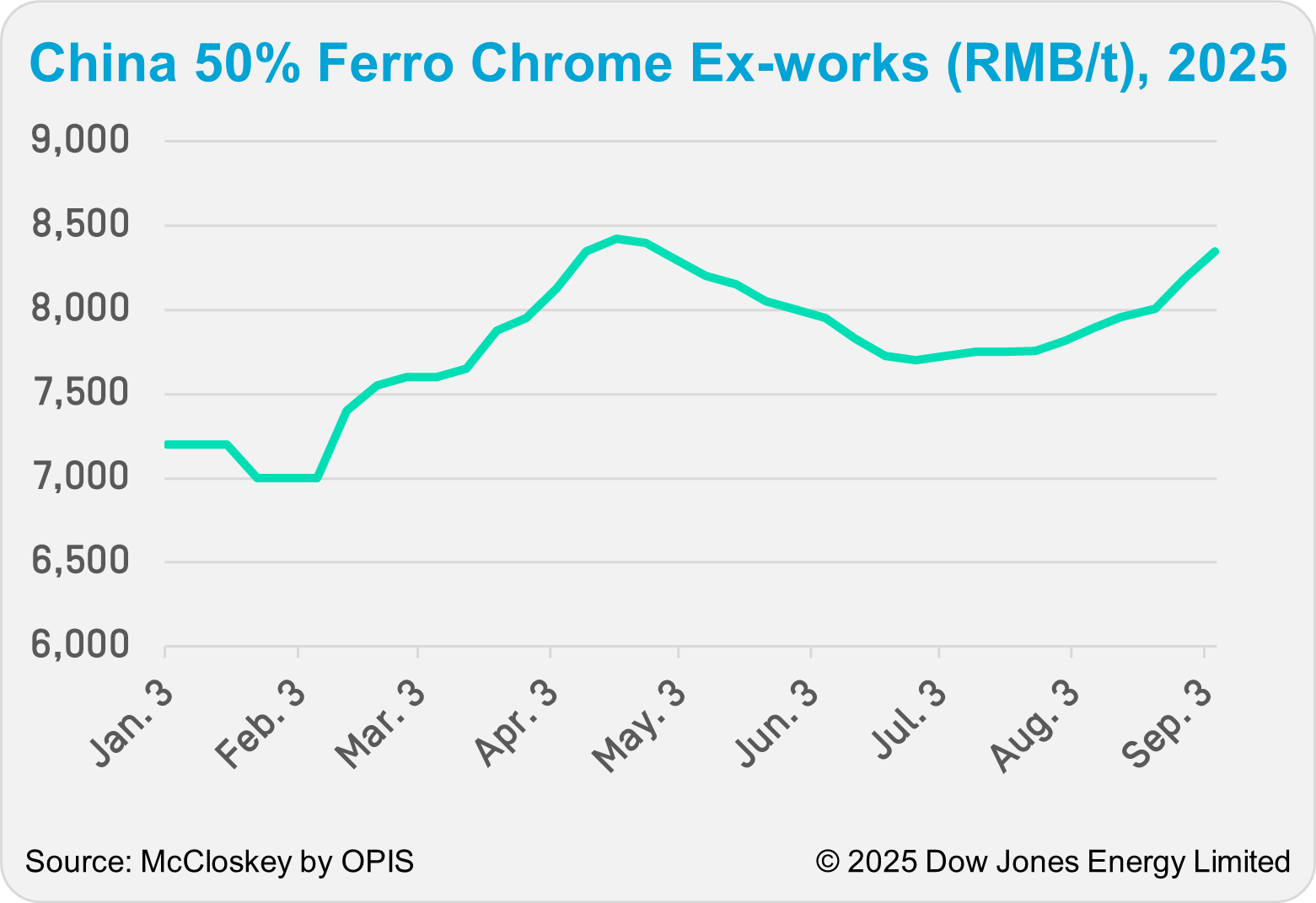 McCloskey on September 5, 2025, assessed the China domestic 50% ferro chrome price at RMB8,365/t ($1,172) ex-works. The India domestic 60% ferro chrome price was assessed at INR115,727/t ($1,314).