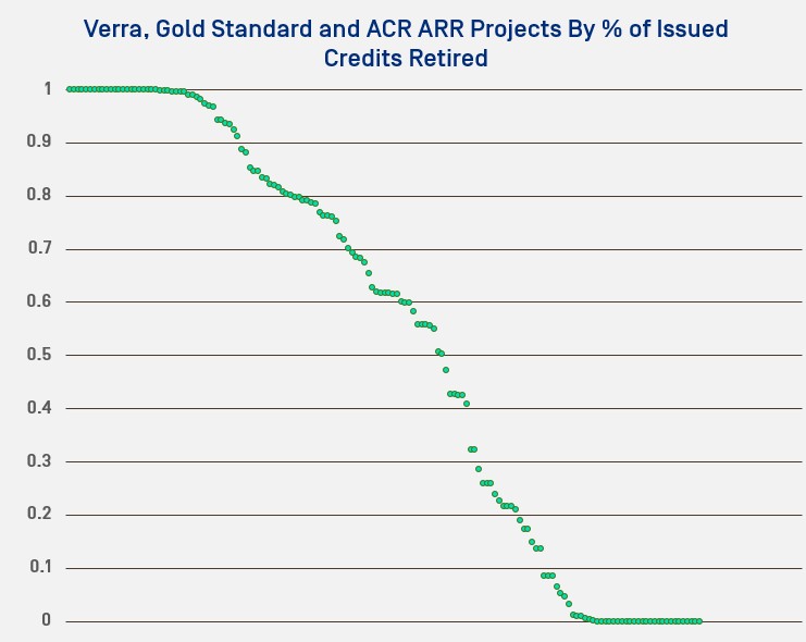 Of the 123 ARR projects registered with Verra, 64 have had 80% or more of their issued credits retired and 32 had 100% of their credits retired, registry records showed.