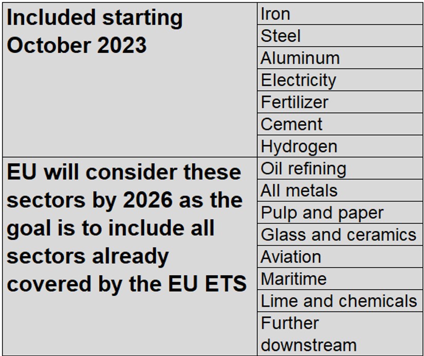 The transitional phase, from Oct. 1, 2023, to Dec. 31, 2025, will correspond to sectors with the highest risk of carbon leakage and with the highest carbon intensity in their products: iron and steel, cement, fertilizers, aluminum, hydrogen and electricity.