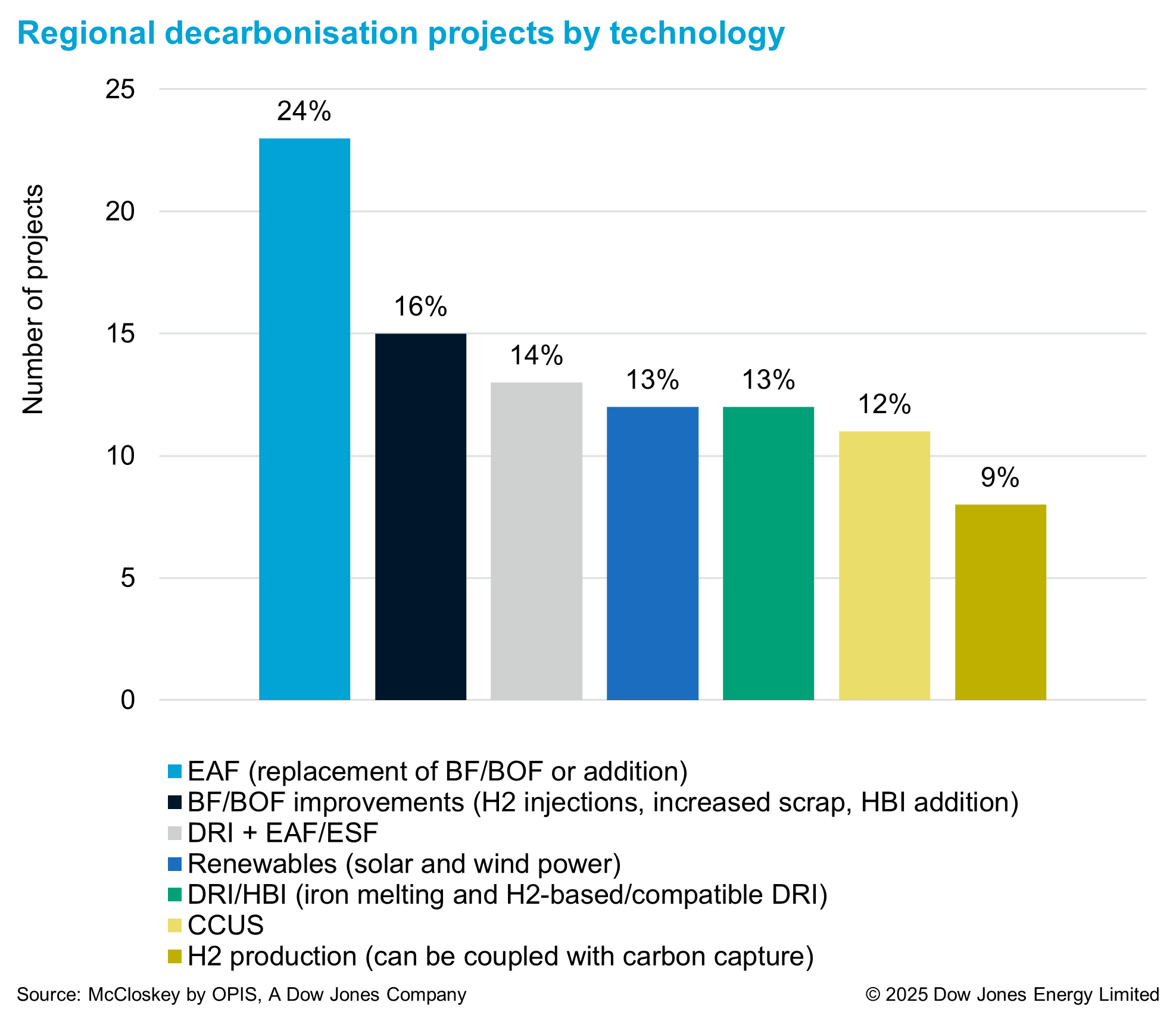 In total, we studied more than 90 decarbonization projects in Asia and Oceania, spanning across various technologies. New EAF installations are leading the way in China and Japan, along with BF/BOF optimisation and development of carbon capture, utilization and storage (CCUS) technologies. Renewables are dominating in solar-rich India, while the DRI-EAF/ESF route is emerging in Australia and South Korea.