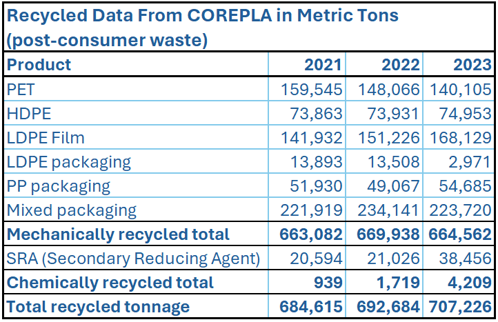 Recycled Data From COREPLA in Metric Tons (post-consumer waste)