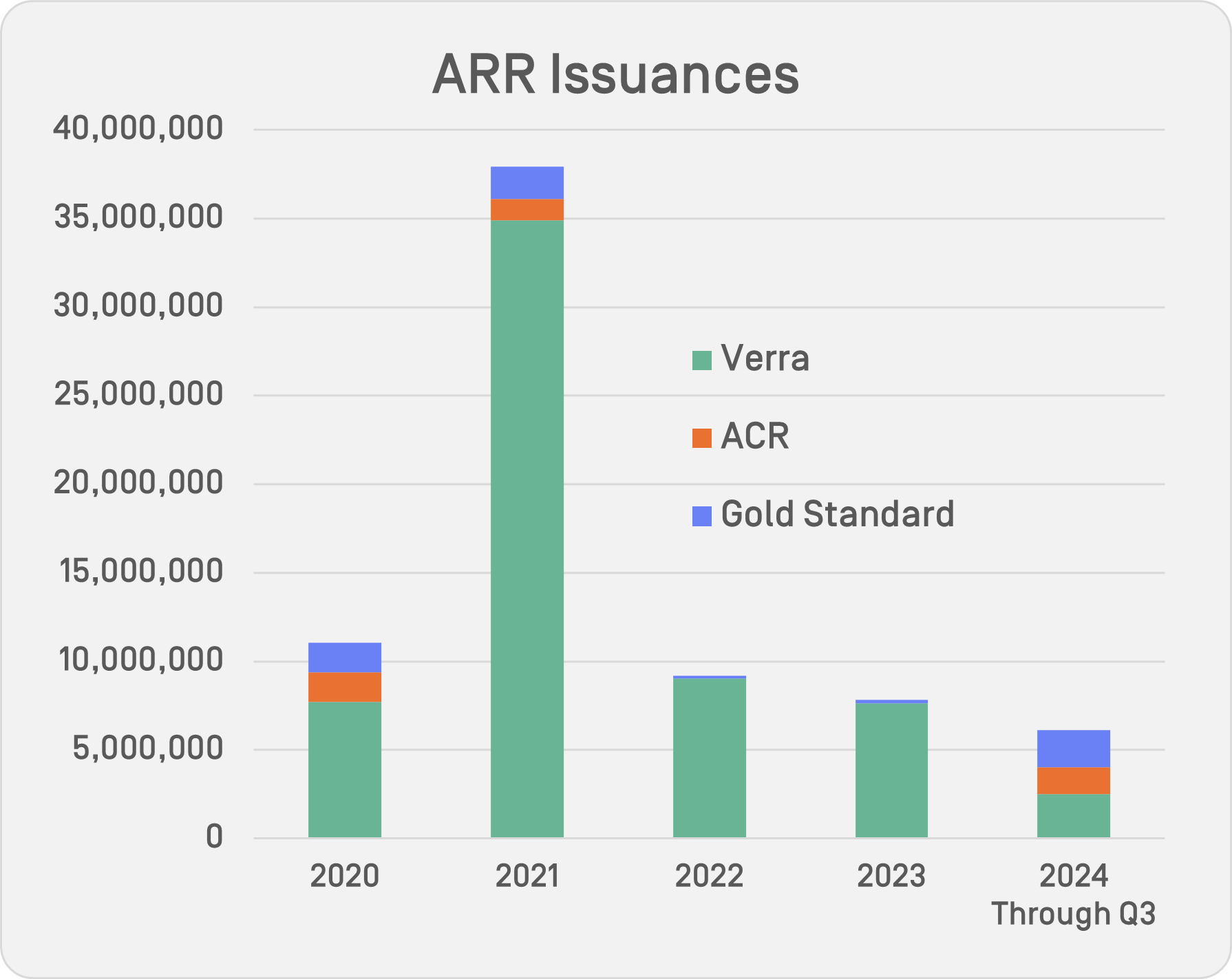 ARR credit issuances across Verra, ACR and Gold Standard hit a peak of 37.9 million credits in 2021, according to registry data. That figure dropped to 9.2 million in 2022 and 7.8 million in 2023. Volumes could fall even further in 2024 as issuances through the first three quarters of the year reached 6.1 million. In Q3 2024, just 770,111 credits were issued.