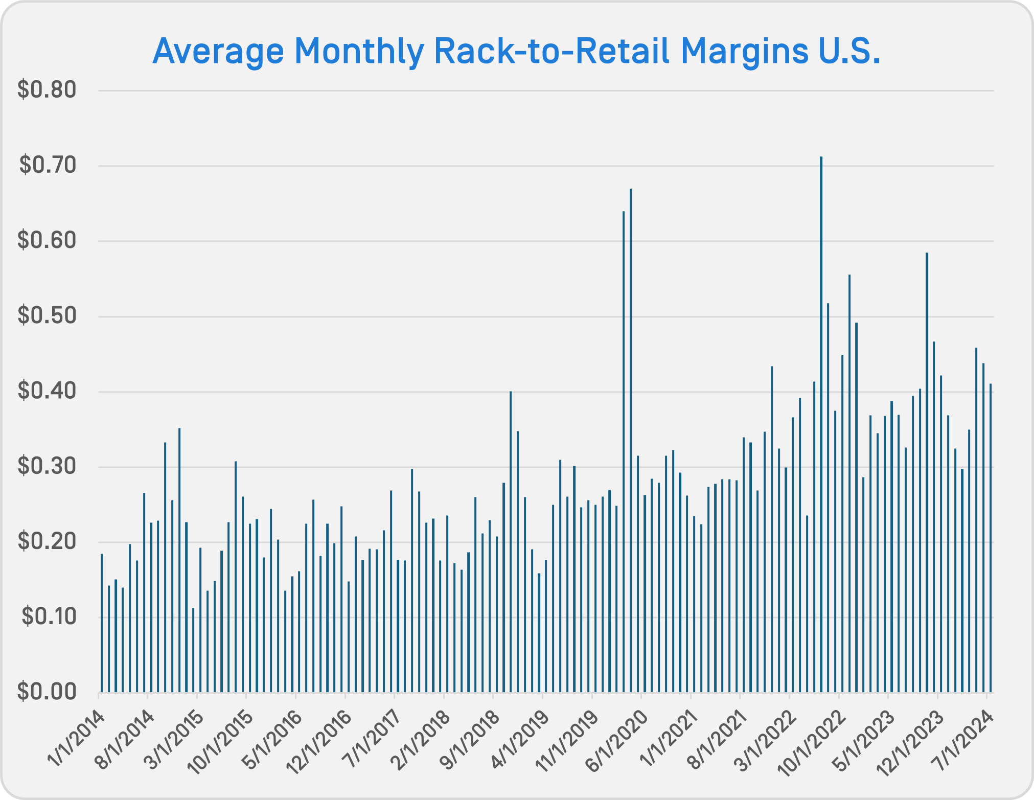 Gross rack-to-retail margins over the course of this decade have started to grow and in some periods of the year quite significantly. The firming of margins over time has brought the axiom “40 cents is the new 20 cents.” Between 2014 and 2019, annual gross rack-to-retail margins averaged from about 22-24cts/gal, but that has all changed over the past five years.