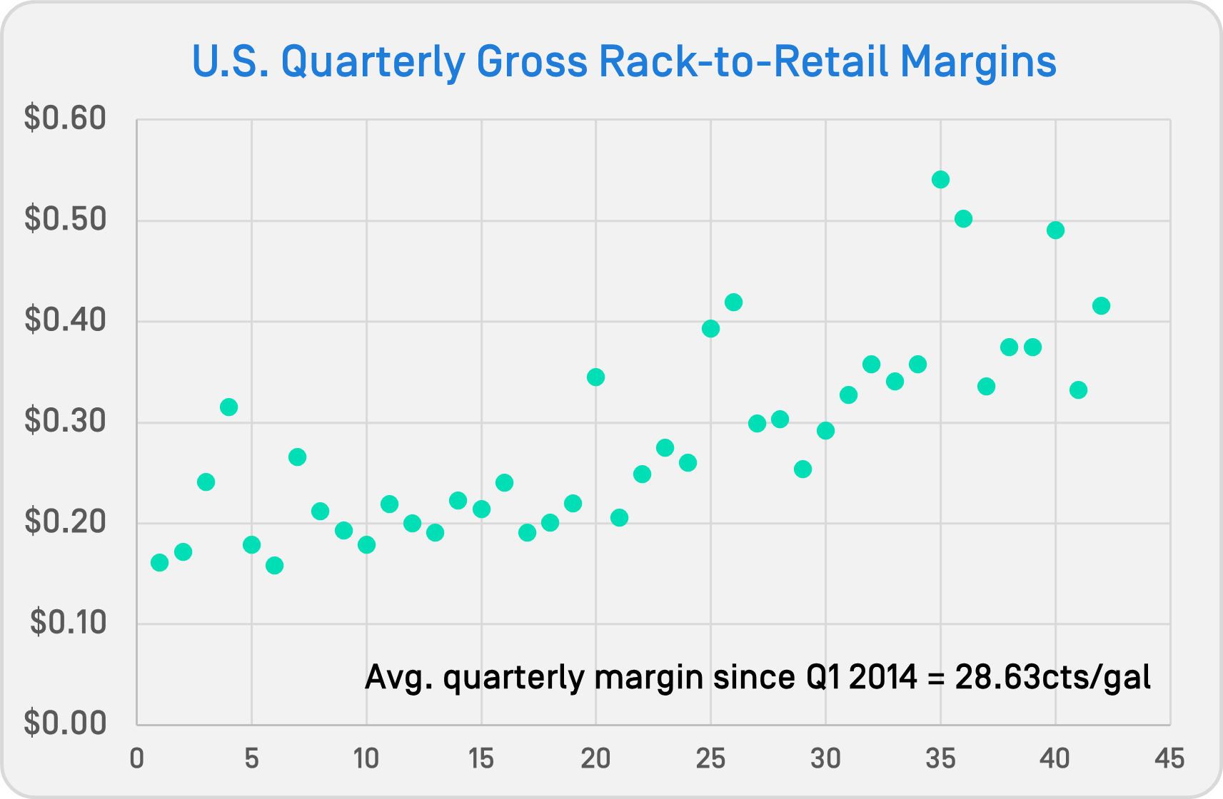 This wholesale gasoline prices chart shows the US quarterly gross rack-to-retail margins chart for gasoline retailers.