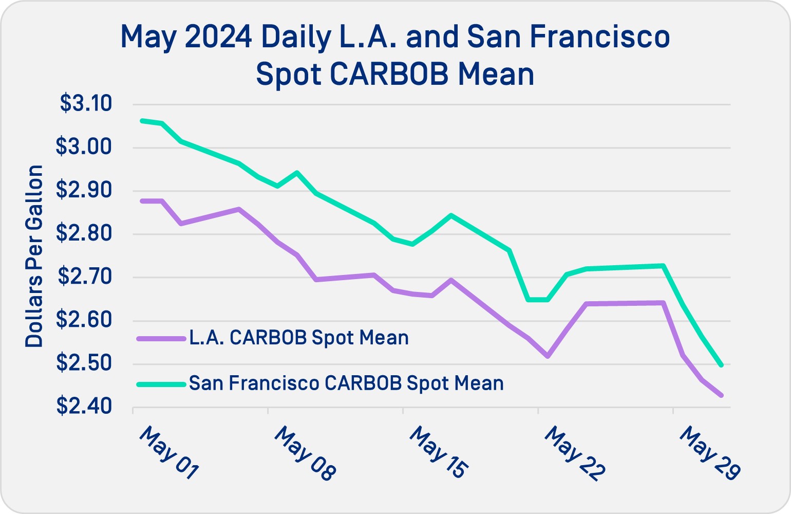 At the beginning of May, Los Angeles CARBOB was pricing around $2.825 per gallon, with San Francisco at $3.015 per gallon, OPIS spot market data shows. But by the end of the month, L.A. gasoline was almost 40 cents cheaper at $2.4275 per gallon with San Francisco more than 50 cents cheaper ending the month at $2.4975 per gallon.