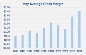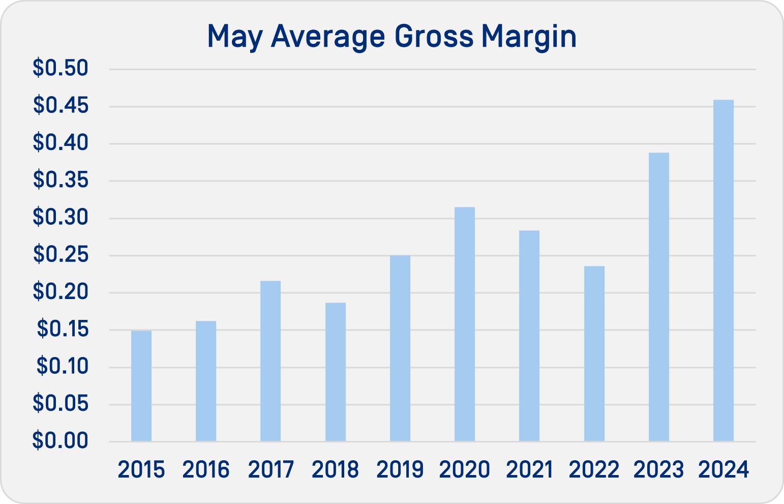 Based on the latest OPIS data, the average gross margin for the month of May came in at 45.9 cents per gallon. The May average margin was the strongest one-month average since November 2023 and it was easily the strongest May on record, as no other May has come close. Over the past 10 years (including 2024) the average margin for May was around 26.5 cents per gallon.