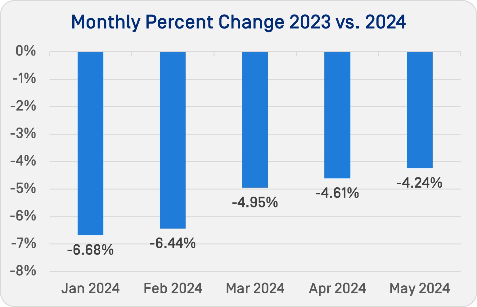 Though month-to-month volumes are getting some traction, same-store sales versus 2023 are still looking soft. Final May gasoline demand was about 4.2% below May 2023, but if you are looking for the positive, the year-on-year trend is narrowing as the month of May saw the smallest loss in volume compared to a year ago. In fact, May was the smallest year-on-year loss since August 2023.
