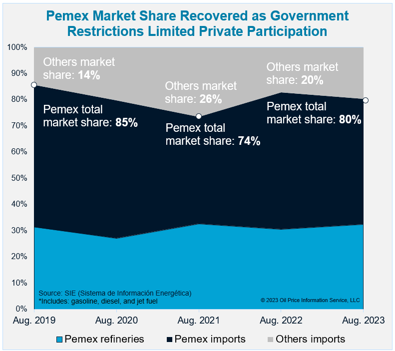 Pemex Market Share Recovered as Government Restrictions Limited Private ParticipationMGC’s aggressive discounts and credit guarantees have squeezed private competitors and smaller Pemex fuel distributors, a market participant told OPIS.