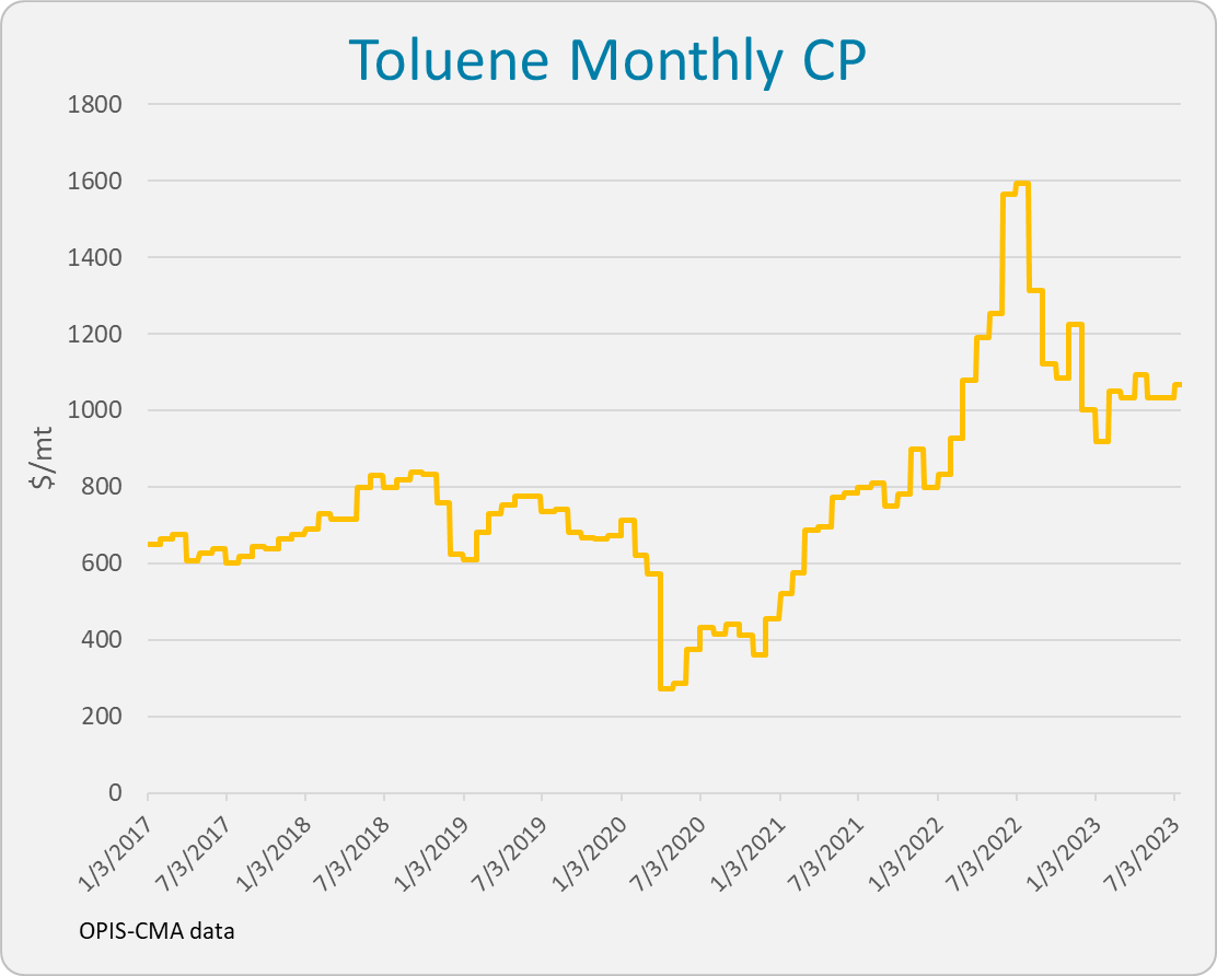 Luckily there is always a daily and monthly spot European toluene price from OPIS, which can reliably be used for any price negotiations.