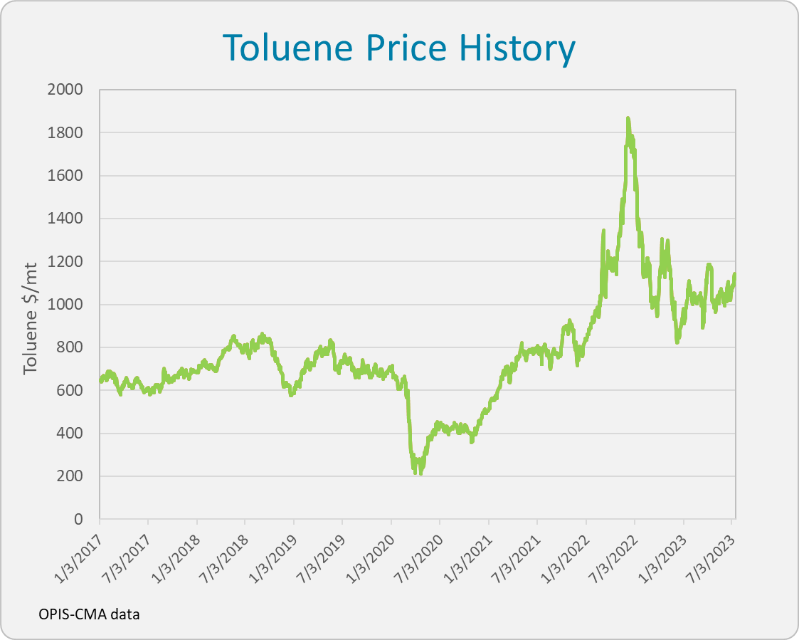 And on the other side of the equation, supply has wavered as producers have struggled with high costs, lowering toluene extraction rates to focus on supplying contract volumes and adjusting toluene inventories lower to manage excess supply.