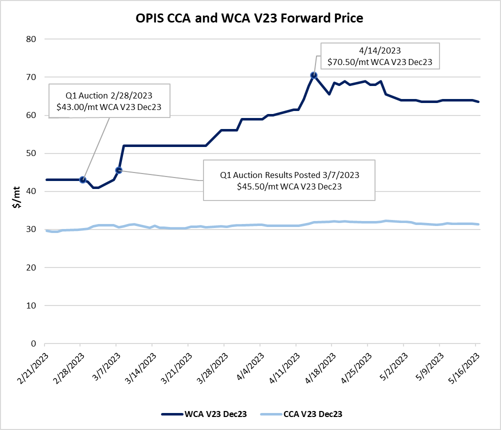 In emission trading markets, the secondary market price for carbon allowances and those bought at auction are typically tied closely together, with one acting as a price signal for the other dependent on market conditions, as allowances bought at quarterly auctions can be resold into the secondary market. On Wednesday, OPIS assessed WCA V23 December 2023 at $64/mt.