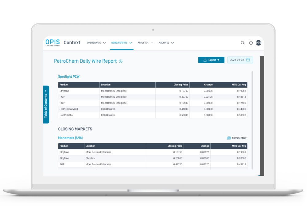 PetroChem Wire by OPIS is recognized by CME NYMEX and ICE as the benchmark for futures contracts and risk management. The PetroChem Wire Daily focuses on spot ethylene, propylene, polyethylene and polypropylene transactions. View the PetroChem Wire Daily Fact Sheet to learn more.