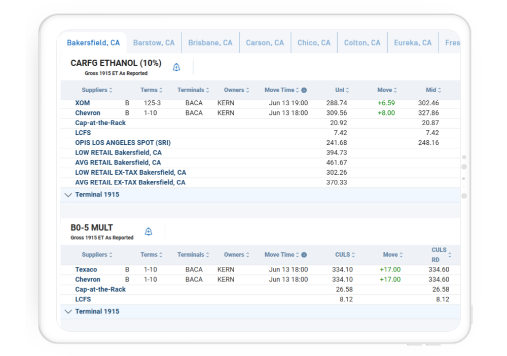 OPIS RackPro reports list supplier posted gasoline and diesel pricing at hundreds of U.S. rack locations with various grades, types, blends and RVP included. Historical and ad-hoc rack prices are also available. Report delivery is via email, FTP API or online on the OPIS RackPro platform, available also on mobile. For fastest service, be sure to select which rack location(s) you would like to preview when completing the form.