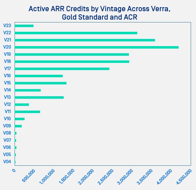 Between Verra, Gold Standard and ACR, registered ARR projects had 25.6 million active credits. An unknown portion of those have been sold and held for future trading or retirement.