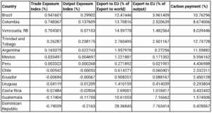 Conversely, Chile, Ecuador, Uruguay, Costa Rica, Guatemala, and the Dominican Republic have carbon costs lower than the EU average (3.21%), suggesting a potential competitive gain. The Dominican Republic stands out with a high share of exports to the EU (28%) and the lowest carbon cost intensity of 0.42% per dollar imported.