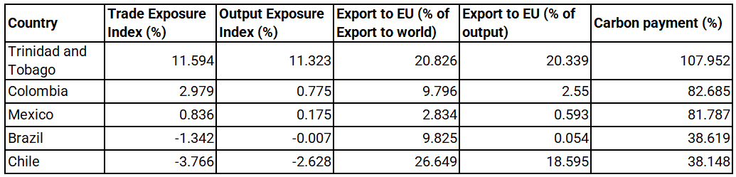 Countries like Trinidad and Tobago (TEI 0.262), Argentina (TEI 0.163), Mexico (TEI 0.033), and Peru (TEI 0.003) show more limited exposure due to lower trade volumes or more favorable emissions profiles, though they are still at a disadvantage. Trinidad and Tobago, despite only sending 2.7% of its total sector exports to the EU, has the highest carbon cost intensity in the region at 12.73%.