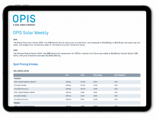 Try OPIS Solar for free. Each Tuesday you will receive an in-depth solar industry analysis report with the week’s polysilicon, wafer, cell and module price assessments, historical price data and expert insight to put it all in context. Each month receive a policy tracker that breaks down the solar policies introduced in the U.S. and Europe. The service also includes intraday and mid-week updates to keep you ahead of market activities.