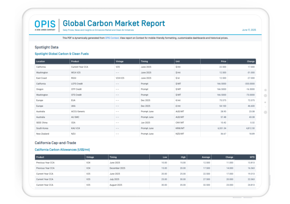 • The OPIS Global Carbon Market Report addresses the demand for transparent compliance carbon market pricing amid the growing number of jurisdictional and regional emissions reduction programs around the world.