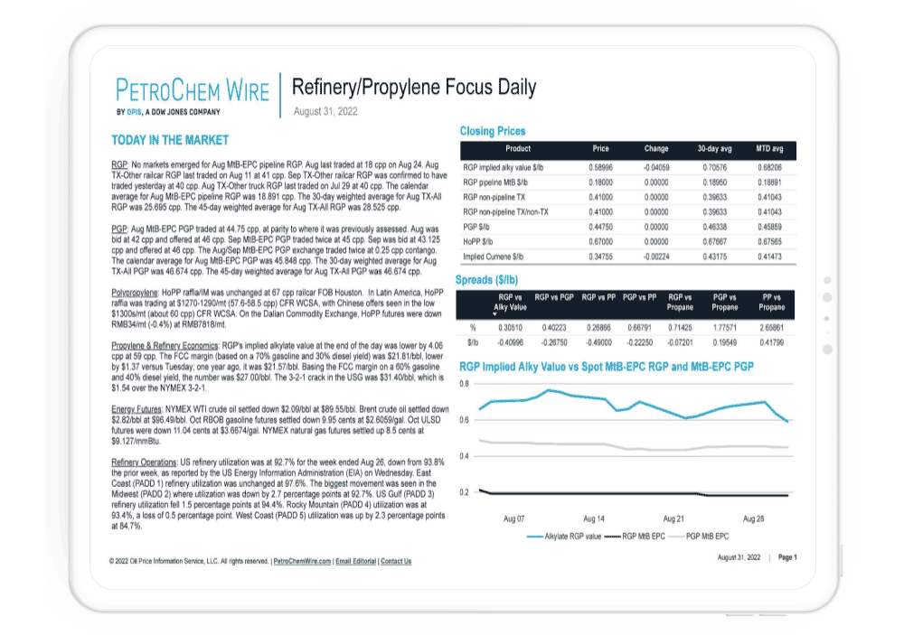 Learn MoreReceive the latest trends and markets for olefins, NGLs, plastics and refined products. This timely market intelligence is sent to you during the trading day.