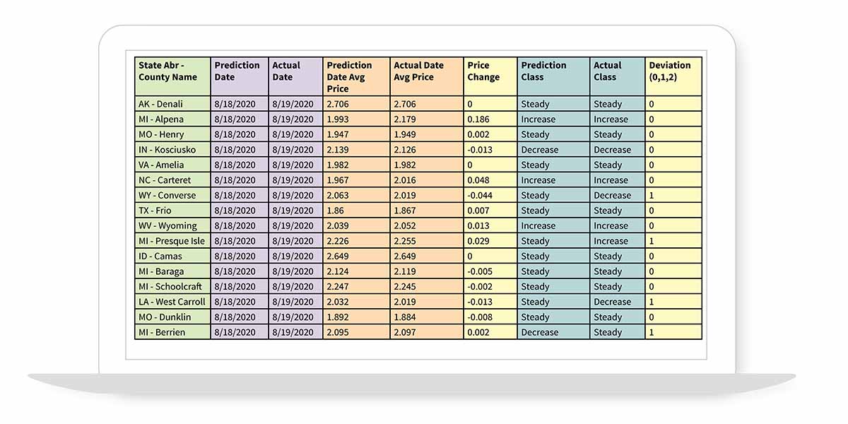 By providing transparency and reporting wholesale prices out of refineries and liquid terminals, OPIS is uniquely positioned to use advanced data science and machine learning techniques to evaluate market behavior over time. This intelligence determines how retail prices react to changes in costs on a regional level. With an average financial accuracy* over time approaching 90%, customers can rely on the predictions to find real cost savings for drivers.